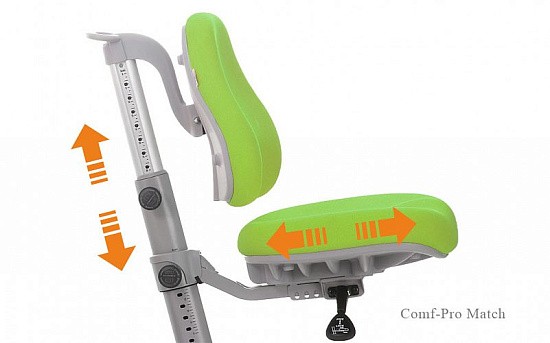 Детское ортопедическое кресло Comf-Pro Match – флагманская модель кресел COMF-Pro, отличное решение для организации рабочего места ребенка с юных до студенческих лет. Универсальная конструкция рассчитана на использование модели с регулируемыми столами, а также обычными школьными партами и письменными столами. Детский стул Comf-Pro Match имеет встроенный механизм, который позволяет регулировать высоту спинки, высоту и глубину посадочного места независимо друг от друга. Это расширяет возможности настройки детского кресла под фигуру ребенка. Анатомической формы спинка не дает ребенку сутулиться во время работы и предотвращает развитие заболеваний позвоночника.