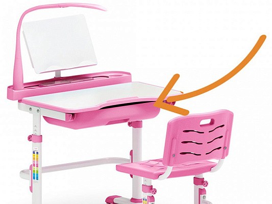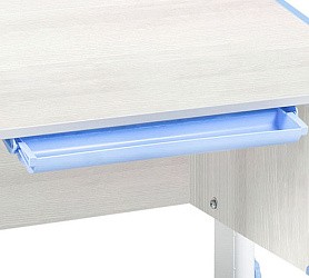Прочная матовая столешница из МДФ дополнительно оснащена пластиковой полочкой, которая включает в себя пенал для карандашей, лампу, подстаканник и подставку для книг. Также столешница может изменять угол наклона. Покрытие столешницы устойчиво к механическим повреждениям и не отражает солнечные блики. Чтобы поддерживать стол в чистоте, достаточно протереть влажной тканевой салфеткой.