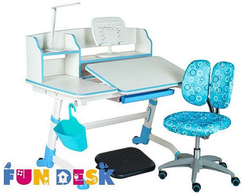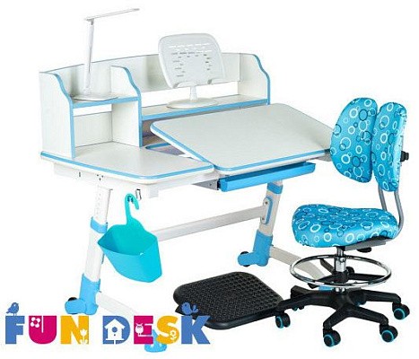«ФанДеск» могут регулировать высоту парты под рост ребенка, а столешница может изменять угол наклона. Каждую модель можно оборудовать дополнительными аксессуарами. Парта «FunDesk» имеет множество ящиков для хранения канцелярских принадлежностей и тетрадей.